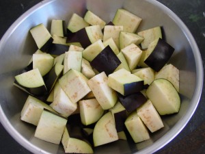 - Cà tím để nguyên vỏ, cắt miếng vừa ăn. Bạn ngâm cà tím vào nước muối loãng khoảng 15 -20 phút để cà không bị thâm rồi cà ra rổ, để ráo.