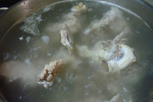 1. Đun sôi 1 nồi nước, thả xương vào đun to lửa cho sôi bùng trở lại, xương tiết ra các chất bẩn thì các bạn tắt bếp, vớt xương ra rửa sạch. Sau đó mới chế nước mới vào đậy vung, ninh nhỏ lửa để lấy nước dùng.