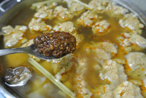 2. Nước dùng sau khi đã ninh xong, các bạn chắt riêng ra nồi dùng ăn lẩu rồi đập dập 2 nhánh sả thả vào cho thơm. Tiếp đó dùng thìa xúc từng viên chả cua thả vào nồi, nêm nếm lượng bột canh vào nồi nước dùng cho vừa miệng.