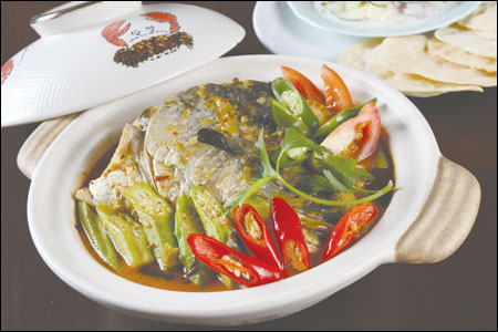 Nguyên liệu: một cái đầu cá chẽm, 100g cà tím, 100g đậu bắp, 100g cà chua, hai quả ớt sừng xanh, đỏ, 300g dừa nạo, 50g bột cà ri cá, 30g quế và hoa hồi, 10g lá cà ri, 50g hành tỏi băm nhuyễn, bốn muỗng xúp dầu ăn. Gia vị: ba muỗng cà phê muối, bốn muỗng cà phê hạt nêm, hai muỗng cà phê tiêu, hai muỗng cà phê đường.