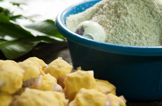 - Gạo nếp ngâm trước 1 đêm, được trộn với nước lá riềng xanh mướt