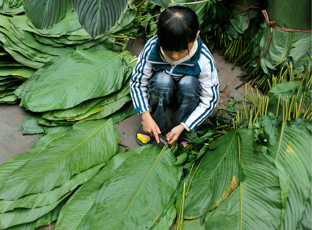 2. Khi chuẩn bị lá dong gói bánh chưng