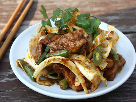 Thịt lợn xào tương ớt kiểu Thái có vị cay nhẹ, thịt mềm, thấm được xào cùng với đậu, bắp cải và thơm thơm mùi lá chanh.