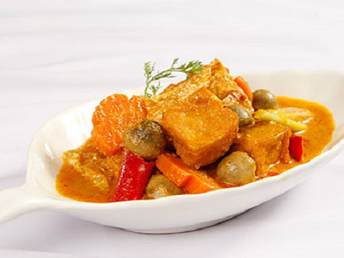Đun nóng dầu điều, xào sả cây, đậu hũ và tàu hũ ki đã ướp, cho cà rốt, ớt hiểm vào đảo cho thấm gia vị, cho thêm nước dão dừa và sau đó cho nước cốt dừa. Nấu vừa sôi thì tắt lửa.