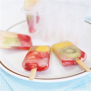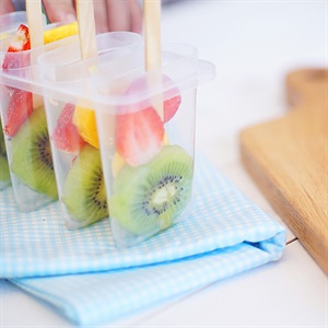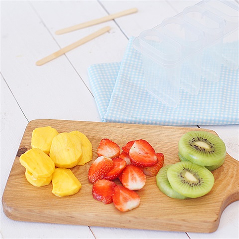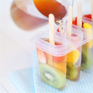 Xếp các lát trái cây vào khuôn, cắm que kem vào. Cho nước trà Nestea vào ngập gần hết khuôn kem.