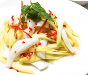 - Trang trí chút ray thơm lên mặt. Gỏi mực trộn xoài ăn kèm với bánh phồng tôm và nước mắm chua ngọt.