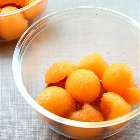 Dưa vàng dùng muỗng múc những hình tròn tròn lấy từng khoanh một đặt vào phía trên chiếc bánh quy.