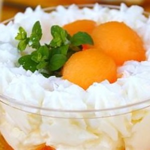Tiếp đó múc kem đổ lên trên dưa. Đặt tiếp vài miếng dưa tròn lên trên, trang trí với vài lá bạc hà cho đẹp và thơm.