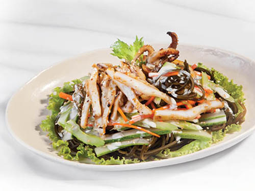 Miếng mực dai mềm cùng dưa leo, cà rốt giòn tan, nhất là có sự kết hợp của phổ tai và mè rang rất thơm và lạ miệng.