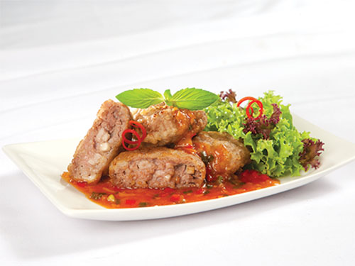 Chả được làm từ thịt xay trộn với nấm, nước xốt thì chua ngọt kích thích vị giác, vị thơm thơm giòn giòn của bột chiên giòn hải sản, ăn vào một miếng là chỉ muốn ăn thêm miếng nữa thôi