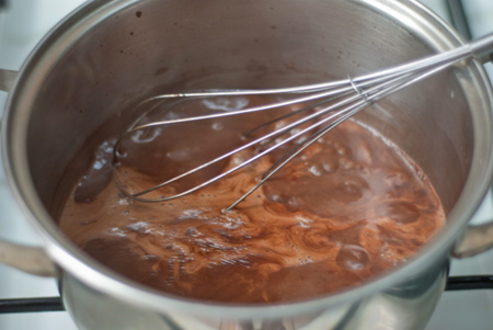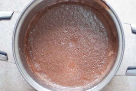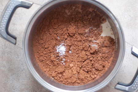 Kết hợp bột ca cao, đường, muối và một nửa số sữa trong chảo vừa.