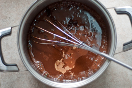 Tắt bếp, thêm socola, vani, rượu thơm và phần còn lại của sữa vào, khuấy đều cho đến khi mọi thứ được kết hợp.
